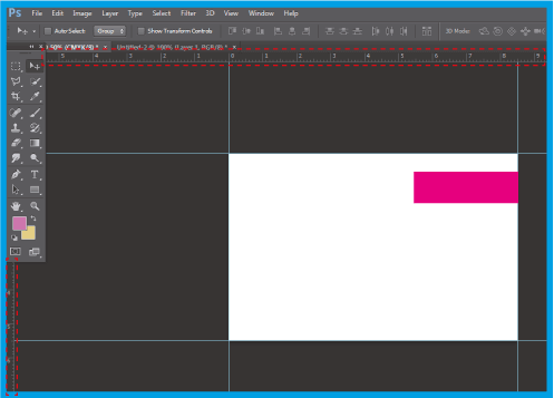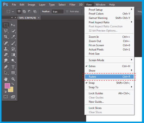 2.1 .Erhöhen Sie die Größe des Canvas , indem Sie Hilfslinien an den Rändern des Dokuments anwenden. Wenn Sie keine sichtbaren Hilfslinien haben, gehen Sie zu View und wählen Sie Lineale .