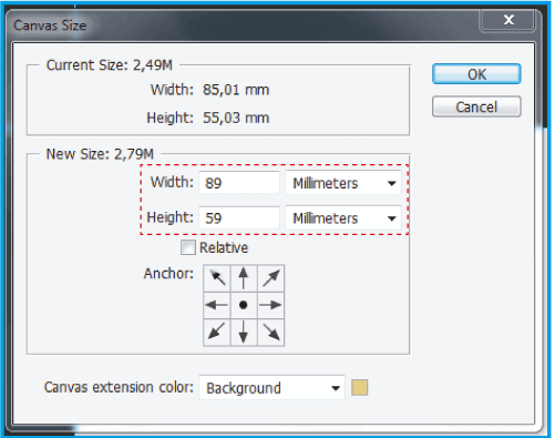 2.4 .In Canvas Size (Bild unten) geben Sie die Größe Ihres Dokuments an. Vergessen Sie nicht, weitere 4 mm in Höhe und Breite hinzuzufügen, um Anschnitt zu erstellen.