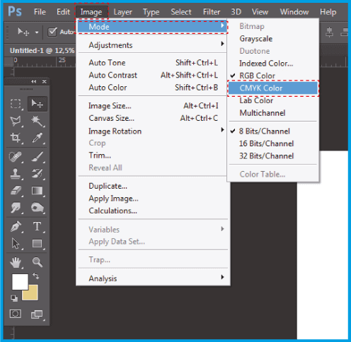 3.1 .Stellen Sie vor dem Speichern des Dokuments sicher, dass Sie es in CMYK ablegen, damit keine Farbänderungen auftreten. Gehen Sie zu Image> Mode> CMYK-Farbe ..