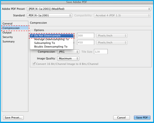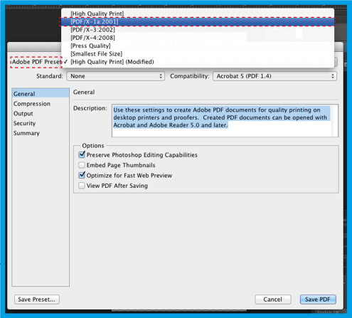 3.3 .Wählen Sie in dem sich öffnenden Fenster in Adobe PDF Preset [PDF/X-1a: 2001] . Diese Option stellt sicher, dass sich die PDF-Datei nicht ändert.