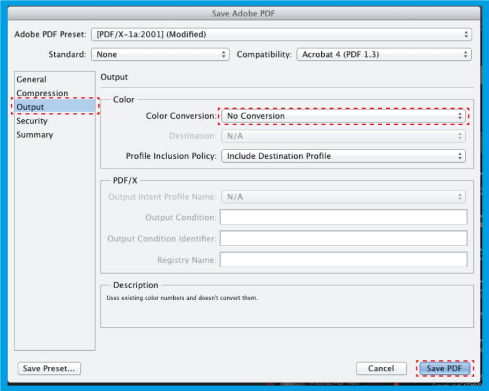 3.5 .Wählen Sie dann Output und auf der rechten Seite in Color Conversion . Diese Option stellt sicher, dass Sie Ihre Datei ohne Farbanweisungen speichern. Klicken Sie dann auf Save Preset..., und speichern Sie diese PDF-Presets mit dem gewünschten Namen PDF speichern .