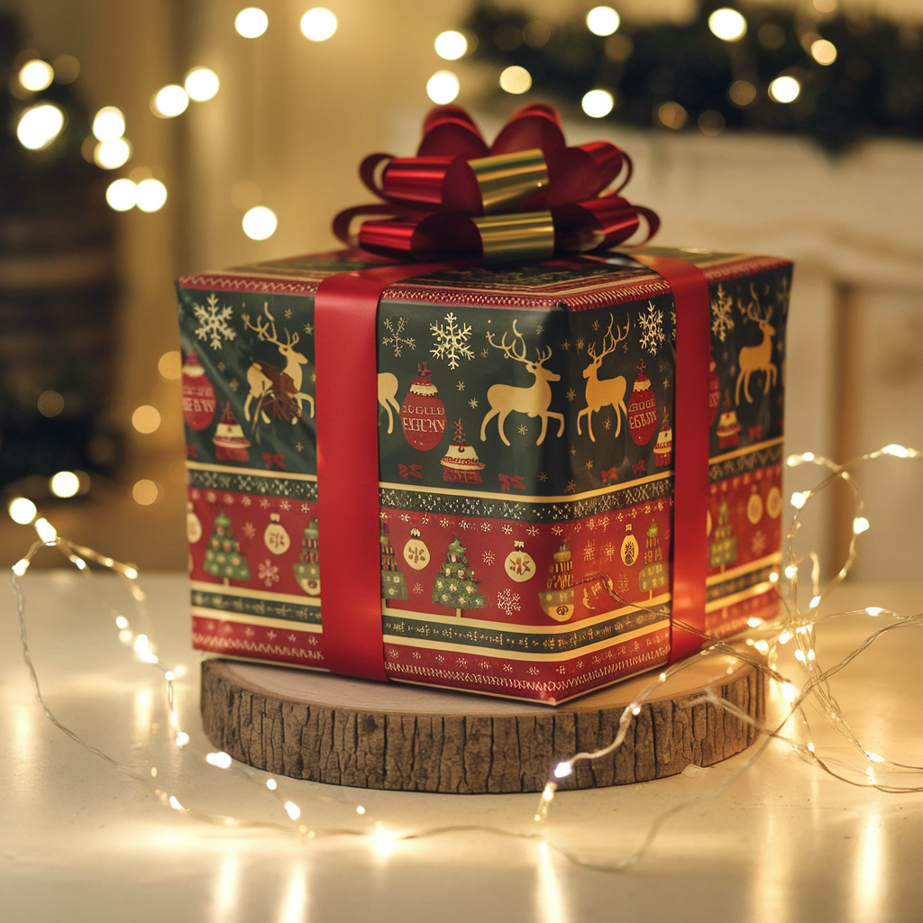 Festliches Geschenkpapier für Weihnachtsgeschenke. Anpassbar mit Urlaubsdesigns, Namen oder Nachrichten. Perfekt für Weihnachtsgeschenke und saisonale Feierlichkeiten.